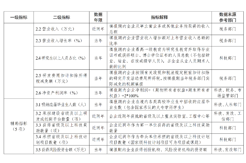 第二類是成長經營指標。該類指標衡量企業長期可持續的成長經營能力,具體包括高新技術產品收入、營業收入、營業收入增長率、研究生以上人員占比、研發費用加計扣除所得稅減免額、凈資產利潤率等6個指標。