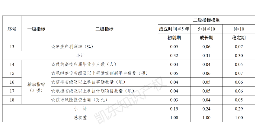 在指標權重設置上,以突出對企業創新能力評價、注重對企業成長經營能力考察為導向,同時劃分了初創期、成長期、穩定期企業不同階段,確定了3類一級指標及18個二級指標的權重賦值(見下圖),